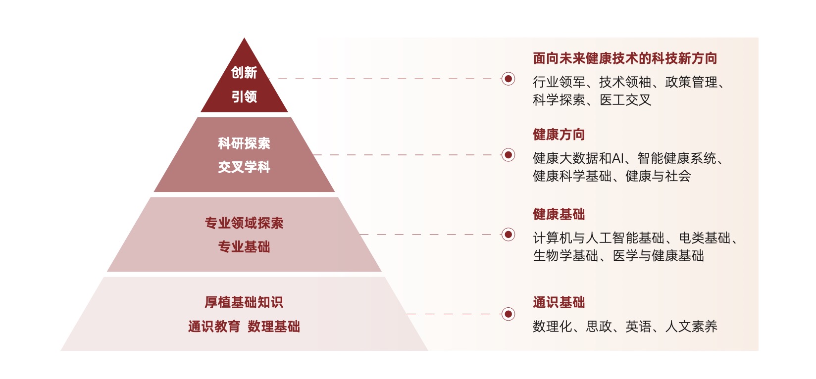 本专业以“人工智能+主动健康”为核心特色,面向打造未来健康新质生产力、满足人类不断提升生活质量的需求,致力于培养具备完善的人格、深厚的社会责任感、丰富的人文素养、扎实的数学、统计学以及人工智能的基础、前瞻性的国际视野、创新精神、批判性思维、团队合作和领导能力的未来领军人才。通过将信息、机械、材料等工程学科与生物、心理、遗传、医药等交叉融合,引领全周期主动健康领域技术向个性化、智能化方向发展,着力于将员工培养成为心脑健康、运动健康、营养健康、环境健康等未来健康新兴产业的科技领军人才。