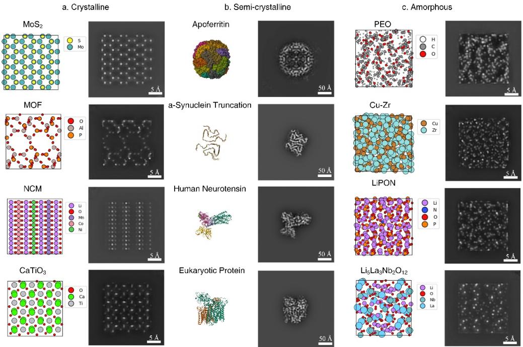 图2:不同结构序材料在低电子剂量下的 4D-MISR 重建结果。 (a) 晶态材料(MoS2、MOF、NCM、CaTiO3)显示清晰的晶格周期性。(b) 半晶态生物分子(载铁蛋白空壳、α-突触核蛋白截短体、神经肽、真核蛋白)保持整体形态。(c) 非晶态材料(PEO、Cu-Zr、LiPON、Li5La3Nb2O12)呈现无序的原子排列。
