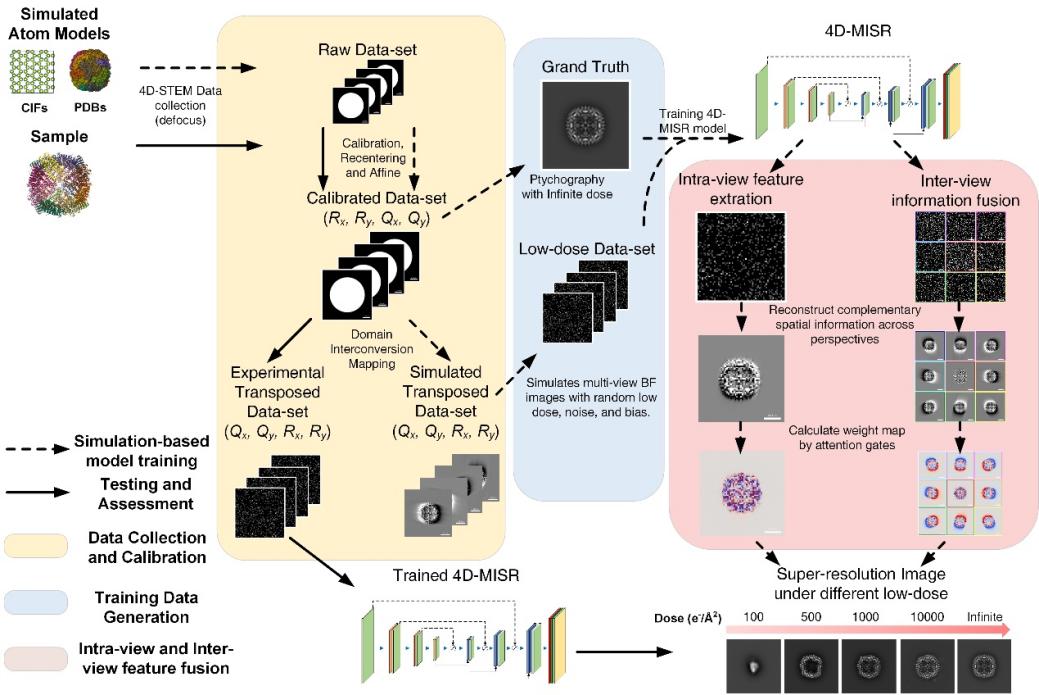 图1:整个流程整合了基于模拟的原子模型数据生成、实验数据的定标与域间映射转换,以及4D-MISR 深度学习模型。该模型通过视图内特征提取与视图间信息融合,在不同电子剂量条件下实现高保真度的超分辨图像重建。