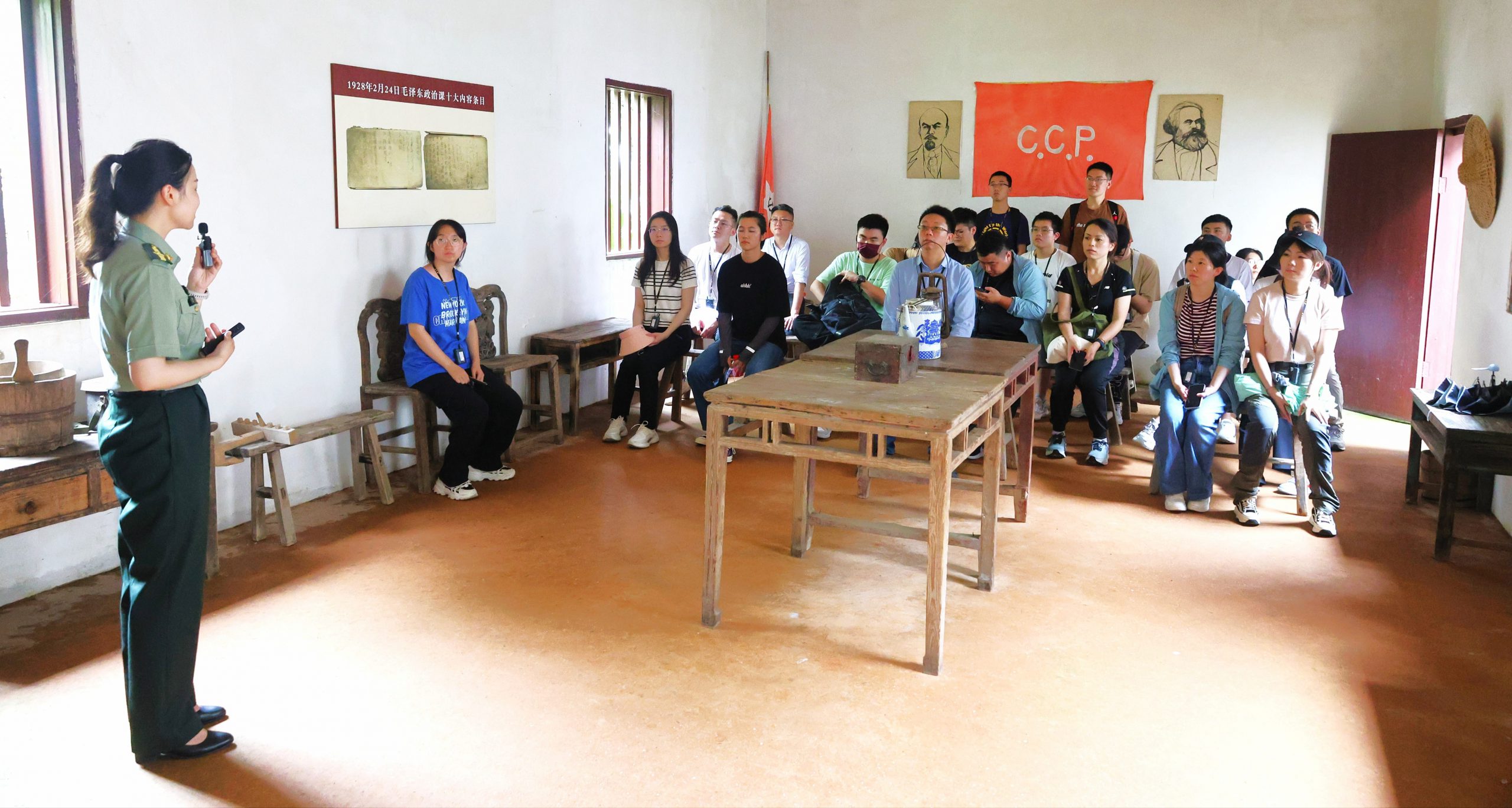宽敞的大堂里,依当年的样式摆放着黑板、讲台和课桌。在这里,仿佛可以看见毛泽东同志挥动着手势,用通俗易懂而又生动幽默的语言在讲着战略战术。简陋的营房、短缺的教具,师生们领略了当年革命战士们克服种种艰苦条件,凭借一身热忱学习知识,立志投身革命的伟大精神。
