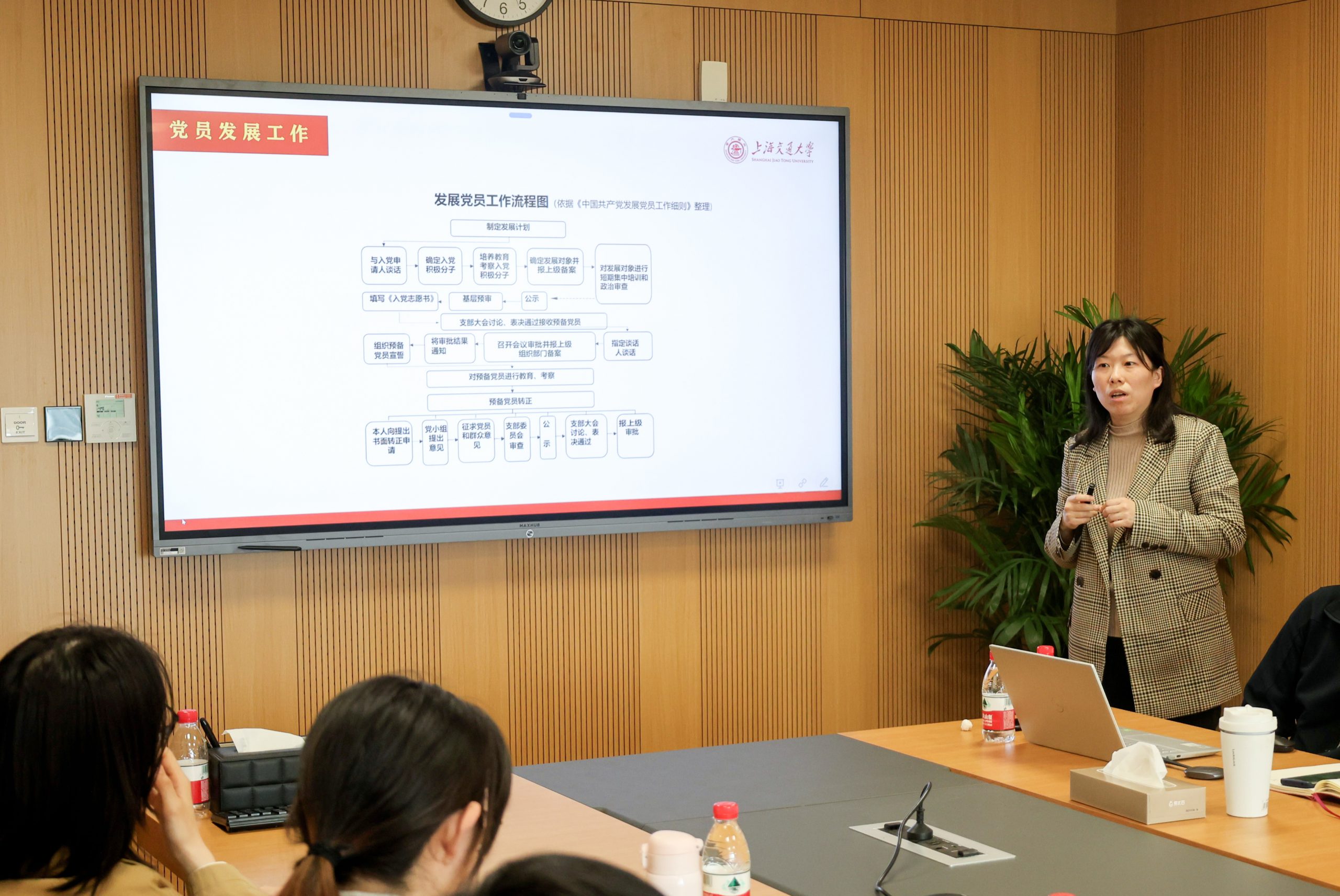 陈蓉蓉为全体师生进行智慧党建系统使用培训。陈蓉蓉系统地介绍了智慧党建中对于党员发展信息维护的操作,同时讲解了不同党内职务的操作权限以及操作流程,演示了线上系统的操作方法,使与会成员了解到党员发展过程中及时更新台账的重要性。