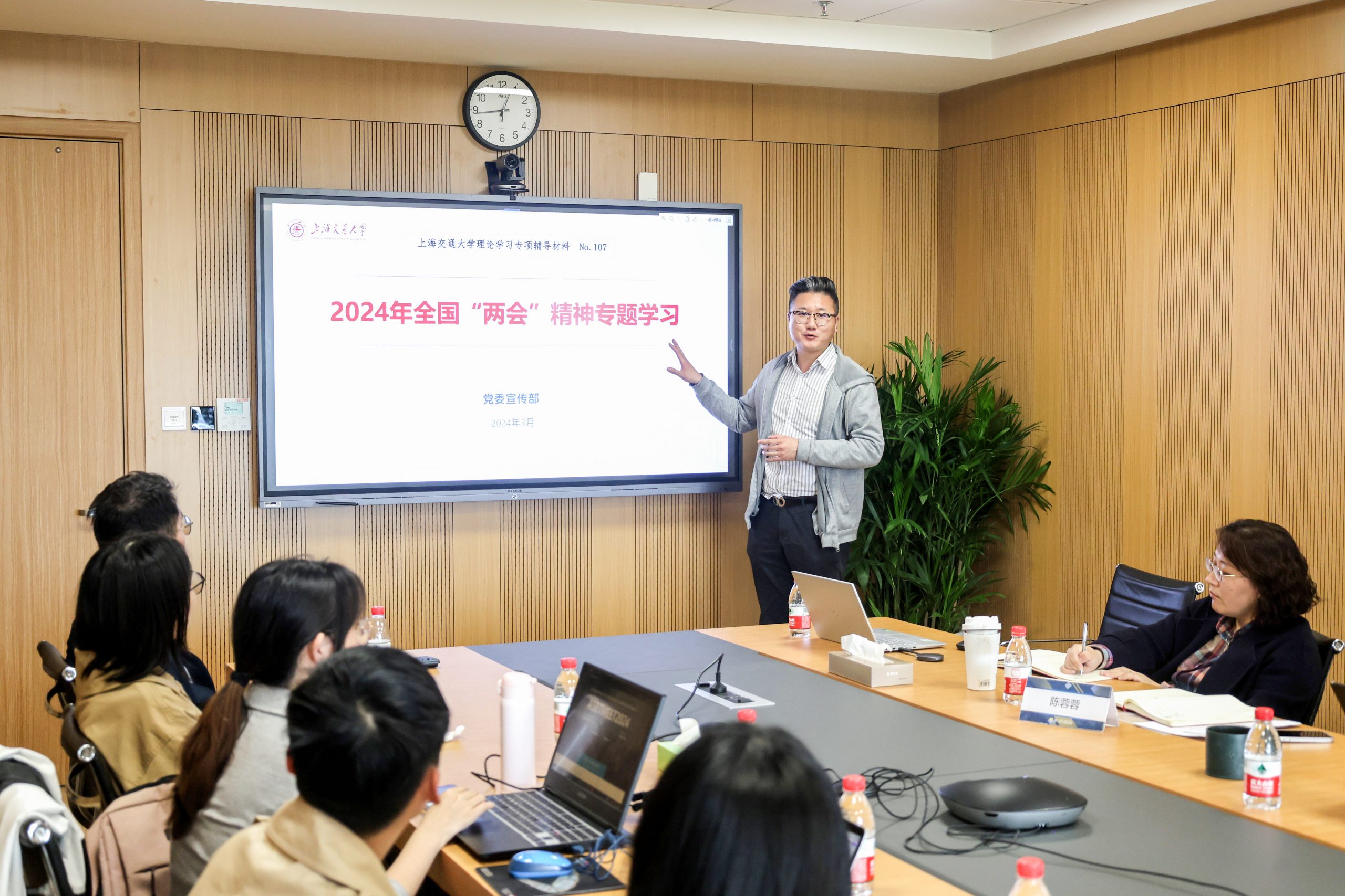 申岩峰作2024年全国“两会”精神专题学习分享。申岩峰从“两会”概况、习近平总书记“下团组”情况、国务院政府工作报告要点、“两会”聚焦以及交大之声等几个层面展开讲授,带领与会人员全面了解了中国特色社会主义制度优越性,深刻领会“两会”为党领导人民以中国式现代化全面推进强国建设、民族复兴伟业提供根本政治制度保障。