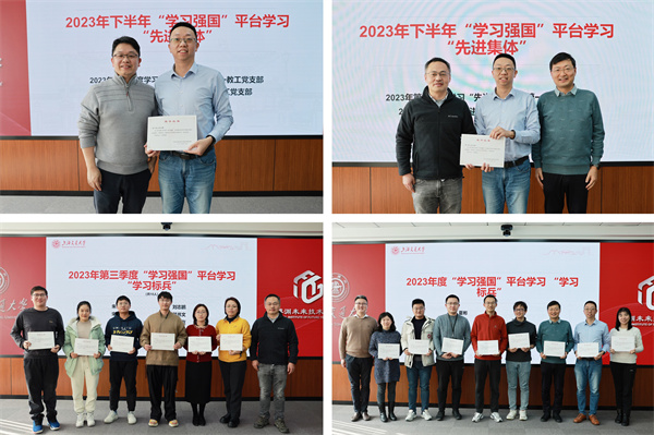 本次党日活动还举行了“学习强国”平台学习情况颁奖仪式,第一教工党支部分别获得2023年第三季度学习“先进支部”、2023年度学习“先进支部” ,朱怡飞、宋立群等十名同志获得2023年第三季度“学习强国”平台学习 “学习标兵” 称号,夏彬、乔恒等十名同志获得2023年度“学习强国”平台学习 “学习标兵” 称号。