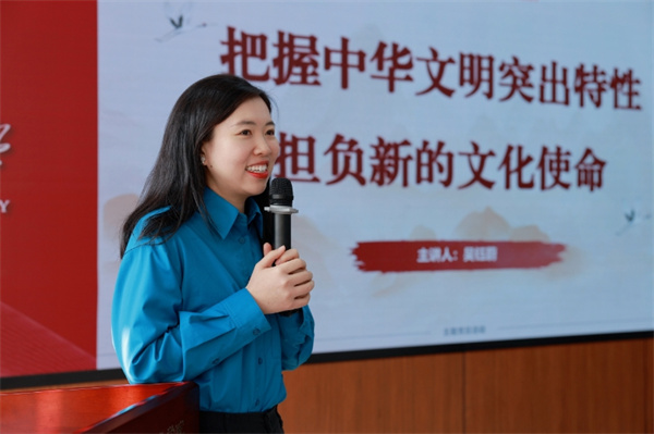 教工党支部代表吴钰蔚带领大家深入学习贯彻习近平总书记关于文化自信的重要论述。中华民族现代文明是习近平在出席文化传承发展座谈会上阐发的重大标志性概念范畴。 从“文化自信”到“创造性转化、创新性发展”再到“两个结合”最后到“建设中华民族现代文明”,这四个核心概念的演进完成了中华民族现代文明立场、方法、原则、目标的建构,体现了人民性、系统性、问题性的整体性特征。新时代新征程,践行新的文化使命必须全面深入理解中华民族现代文明。