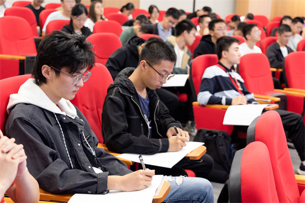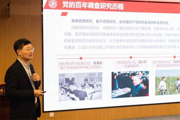 开班式后,杨明授题为《脚踏实地,勇于担当,注重实践,创建新功》的理论课程。杨明从党的百年调研历程、新时代下调查研究的发展创新、调研方法与技术、结合实践开展调研四个部分进行讲授,先回顾了党的十八大前党和国家历任领导人关于调查研究的论述与具体实践,随后系统讲述了习近平总书记关于调查研究的重要论述。杨明分享了在科研与工作中自身对于调查研究重要意义的认识,讲述员工在学习与实践中使用的方法论。最后,杨明为学员介绍了校院开展的社会实践活动,鼓励学员们深入田间地头,了解国情社情,投身建设事业。