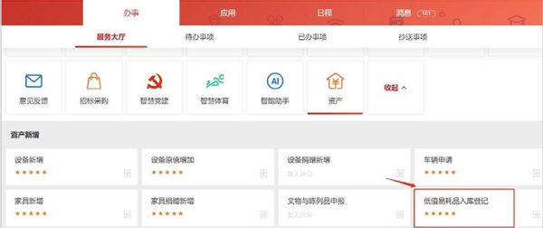 2.登录交我办-服务大厅-资产-低值易耗品入库登记,审批完成后点击财务预约进行报销预约。