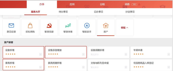 4.固定资产申请:登录交我办-服务大厅-资产-设备新增/或设备原值增加/或家具新增。审批完成后点击财务预约进行报销预约。