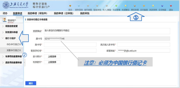 校内人员信息维护:在校师生可通过事项申请-银行卡维护,自助办理银行卡登记或变更。