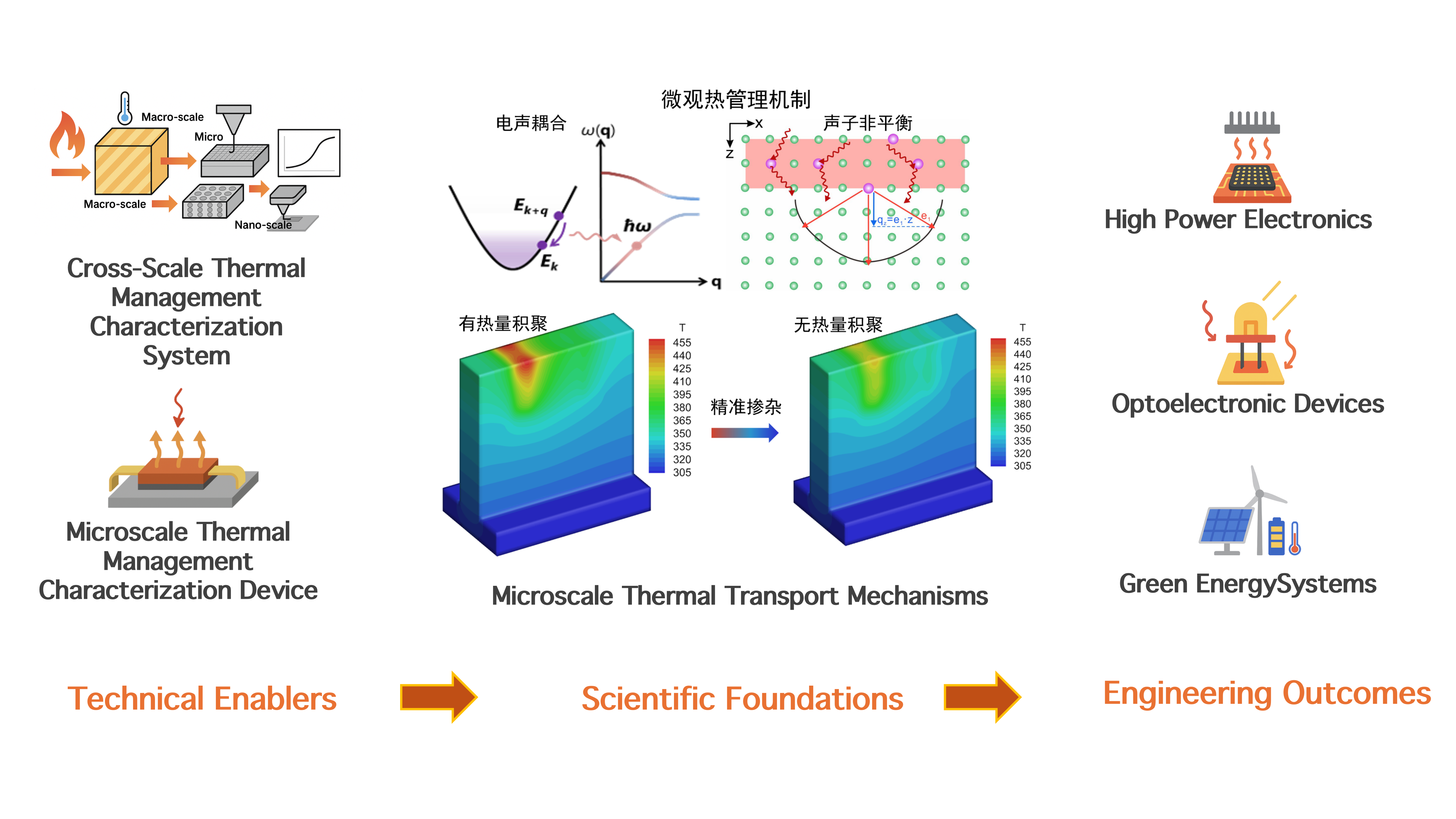 聚焦多尺度热输运与能量耦合优化中的关键科学问题,通过开发微纳尺度热管理技术,创新可再生能源系统集成策略,实现从材料层面到系统层级的热管理和能量转换效率显著提升,为高功率密度电子、光电器件散热和绿色能源规模化利用等领域提供关键解决方案。