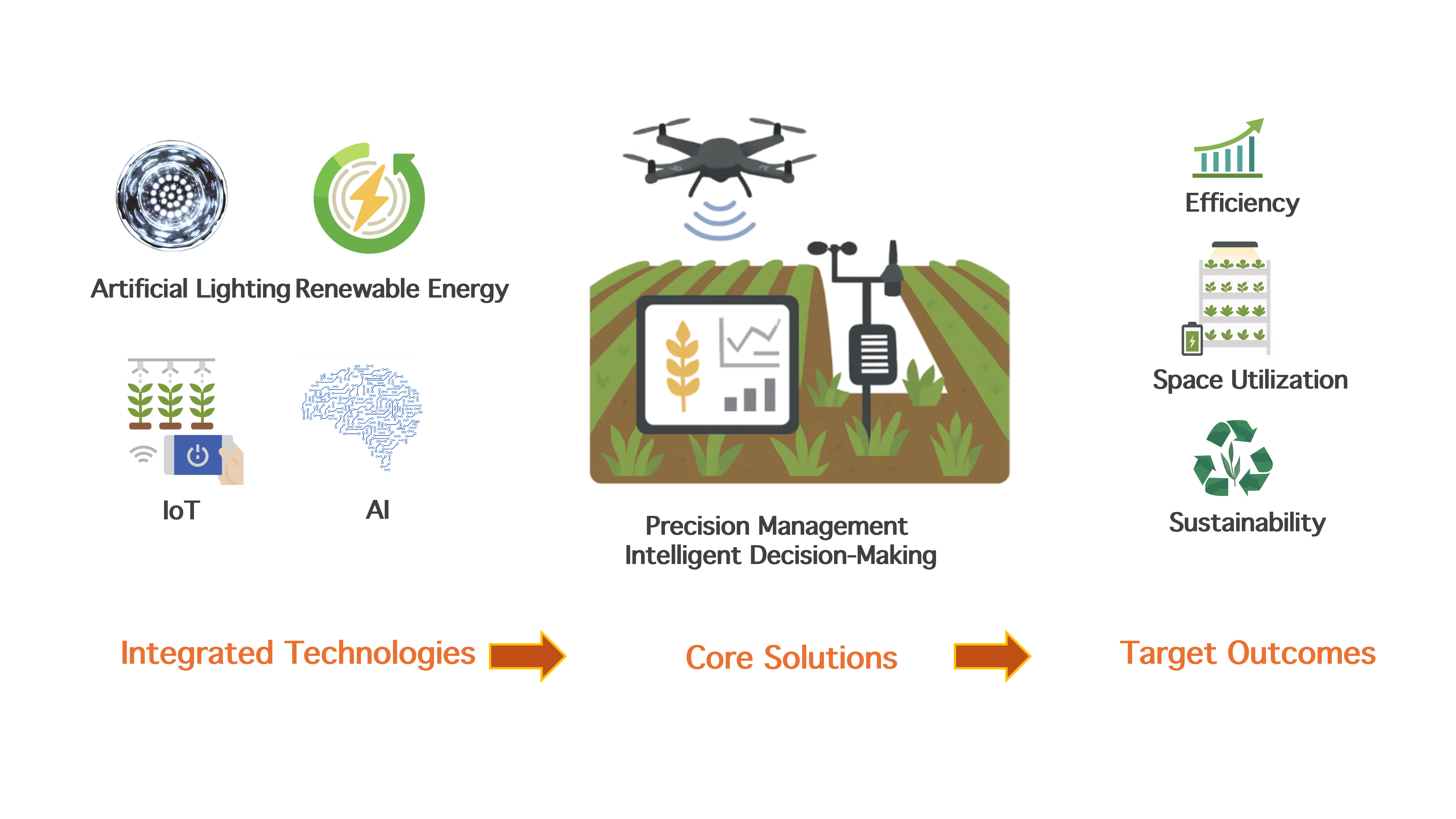 整合物联网、人工智能、人工光源、新能源系统等先进技术,构建农业生产的精准管理与智能决策方案,优化资源配置与生产效率,实现智能化、立体化种植,为解决全球粮食安全、资源短缺和环境污染等重大挑战提供解决方案。